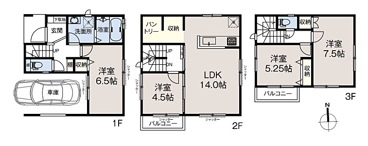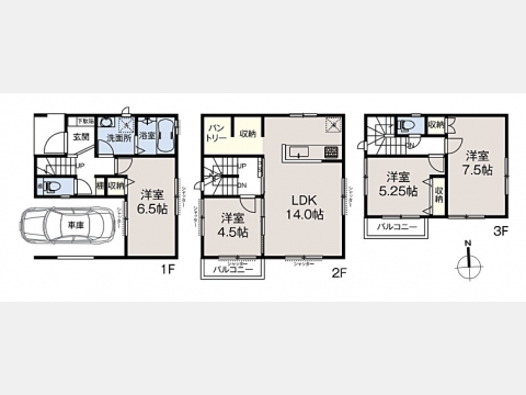 洋室 6.5 畳 LDK 14 畳 2 階 1 室 洋室 4.5 畳 2 階 1 室 洋室 7.5 畳 3 階 1 室 洋室 5.3 畳 3 階 1 室 |
