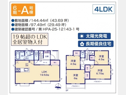 新着更新新築 東大和市高木2丁目〈新築〉西武多摩湖線「武蔵大和」駅徒歩15分 太陽光発電採用住宅 長期優良住宅 ZEH水準省エネ住宅 敷地面積43坪超 浄水器 浴室乾燥機 全2棟6期A号棟