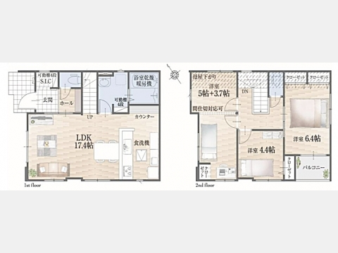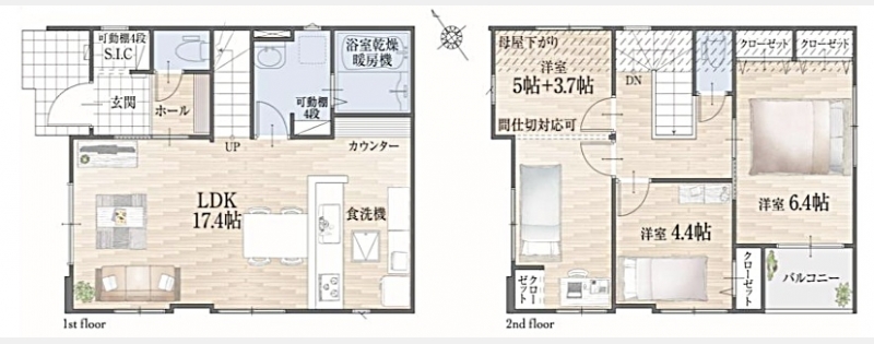 LDK 17.4 畳 1 階 1 室 洋室 8.7 畳 2 階 1 室 洋室 6.4 畳 2 階 1 室 洋室 4.4 畳 2 階 1 室 間仕切り対応可能 |