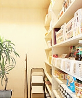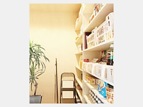 裏収納は5帖と広く、大物の収納や、季節物がたっぷり収納でき助かります。