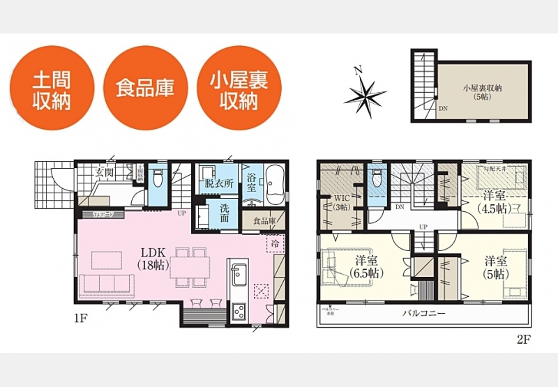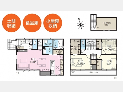 LDK 18 畳 1 階 1 室 洋室 6.5 畳 2 階 1 室 洋室 5 畳 2 階 1 室 洋室 4.5 畳 2 階 1 室 固定階段付小屋裏収納5帖 |