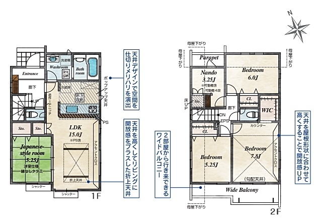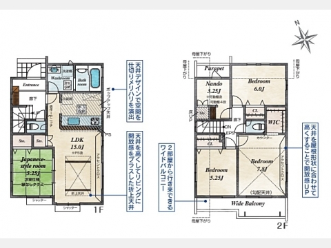 LDK 15 畳 1 階 1 室 和室 5.3 畳 1 階 1 室 洋室 7.8 畳 2 階 洋室 5.3 畳 2 階 1 室 洋室 6 畳 2 階 1 室 納戸3.25帖 |