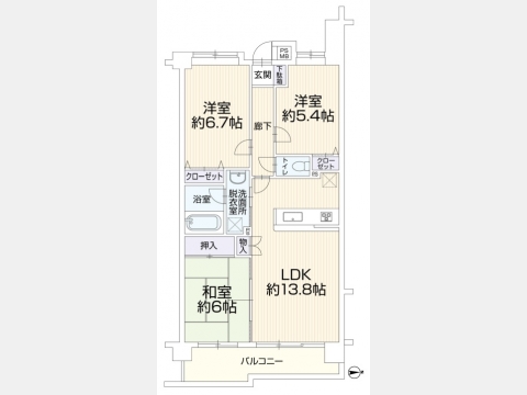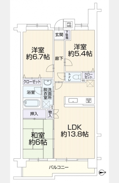 LDK 13.8 畳 和室 6 畳 洋室 6.7 畳 洋室 5.4 畳 |