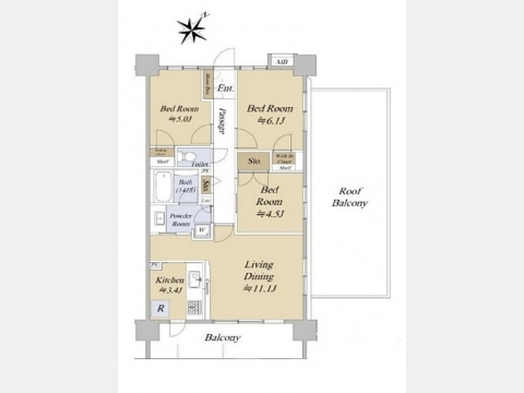 LD 11.1 畳 K 3.4 畳 洋室 4.5 畳 洋室 5 畳 洋室 6.1 畳 ルーフバルコニー(使用料:月額900円) |