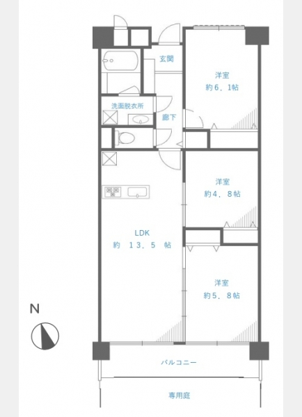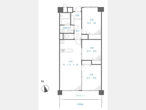 LDK 13.5 畳 洋室 5.8 畳 洋室 4.8 畳 洋室 6.1 畳 |