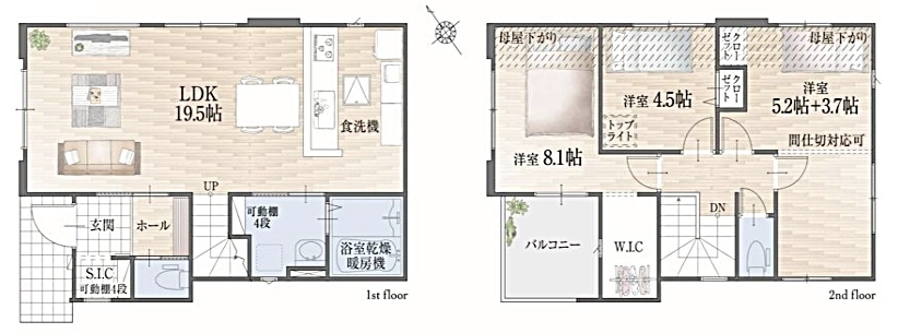 LDK 19.5 畳 1 階 1 室 洋室 8.9 畳 2 階 1 室 洋室 8.1 畳 2 階 1 室 洋室 4.5 畳 2 階 1 室 間仕切り対応可能 |