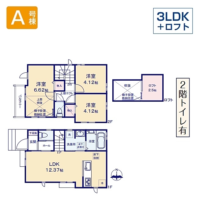 LDK 12.3 畳 1 階 1 室 洋室 6.6 畳 2 階 1 室 洋室 4.1 畳 2 階 2 室 ロフト2.5帖 |