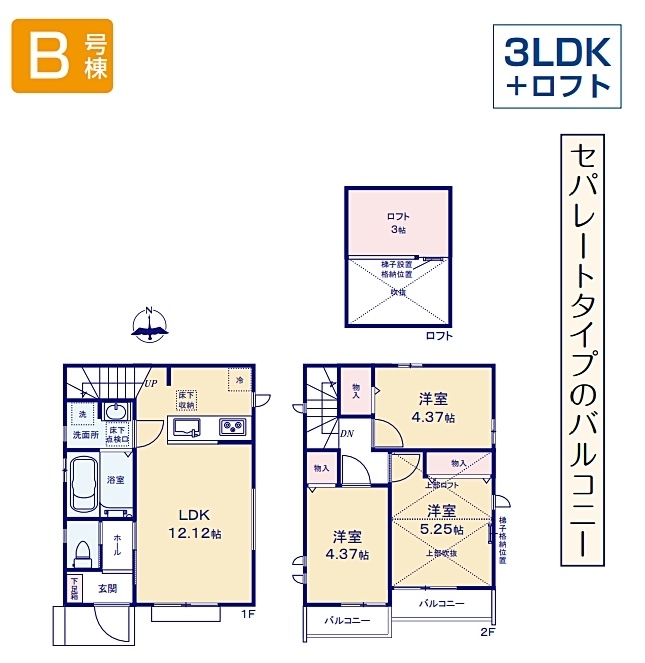 LDK 12.1 畳 1 階 1 室 洋室 4.3 畳 2 階 1 室 洋室 4.4 畳 2 階 2 室 ロフト3帖 |