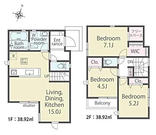 LDK 15 畳 1 階 1 室 洋室 7 畳 2 階 1 室 洋室 5.2 畳 2 階 1 室 洋室 4.5 畳 2 階 1 室 フリースペース |