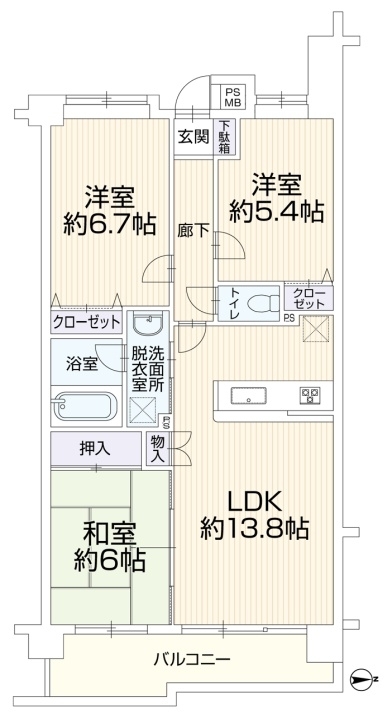 LDK 13.8 畳 和室 6 畳 洋室 6.7 畳 洋室 5.4 畳 |