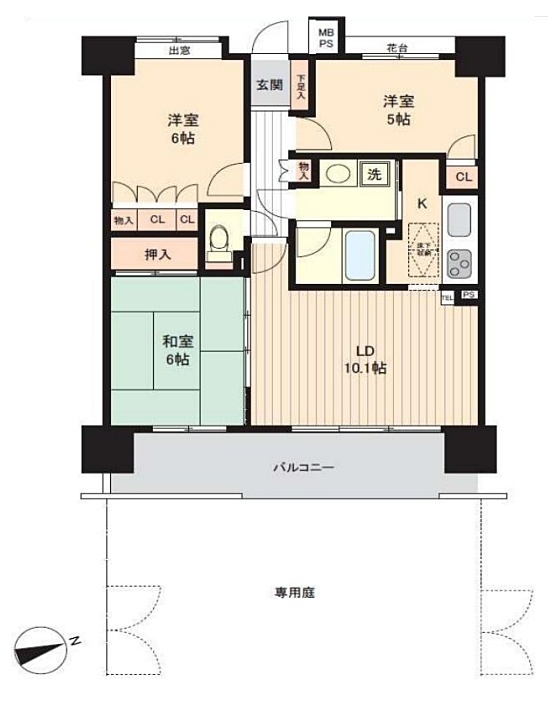 LDK 10.1 畳 和室 6 畳 洋室 6 畳 洋室 5 畳 28㎡専用庭付き |
