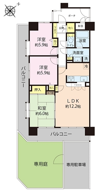 LDK 12.2 畳 和室 6 畳 洋室 5.9 畳 洋室 5.9 畳 26㎡専用庭付き |