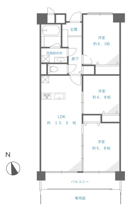 LDK 13.5 畳 洋室 5.8 畳 洋室 4.8 畳 洋室 6.1 畳 |